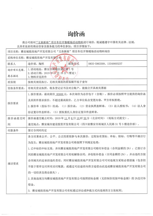 雅安城投房地產(chǎn)開(kāi)發(fā)有限公司“文曲新座”項(xiàng)目車(chē)位開(kāi)售暖場(chǎng)活動(dòng)物料詢(xún)價(jià)函(第二次)