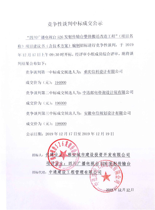 四川廣播電視臺526發(fā)射傳輸臺整體搬遷改造工程項目建議書(含技術(shù)方案)編制招標(biāo)競爭性談判中標(biāo)成交公示