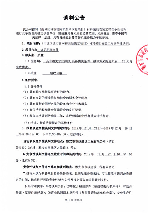 《雨城區(qū)城市管網(wǎng)和泵站恢復(fù)項(xiàng)目》材料采購安裝工程競(jìng)爭(zhēng)性談判公告