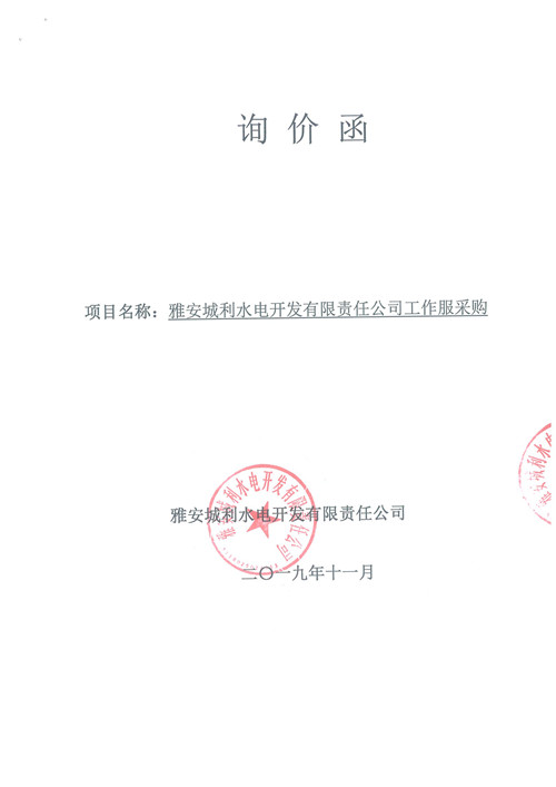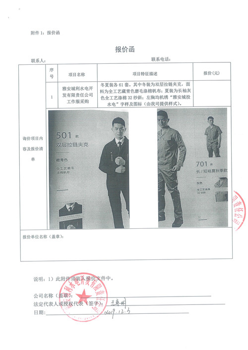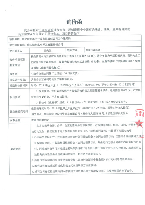 雅安城利水電開發(fā)有限責(zé)任公司工作服采購詢價函