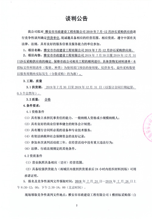 市政公司2019年7月-12月沙石采購(gòu)供應(yīng)商競(jìng)爭(zhēng)性談判公告