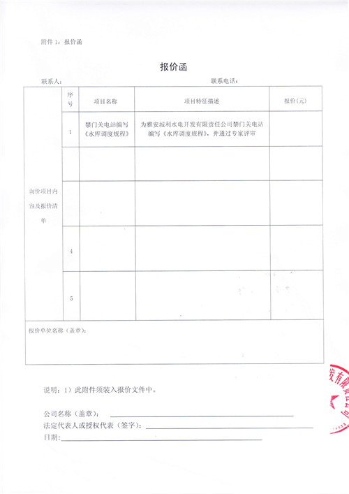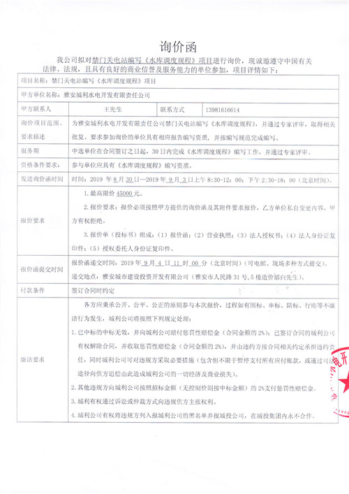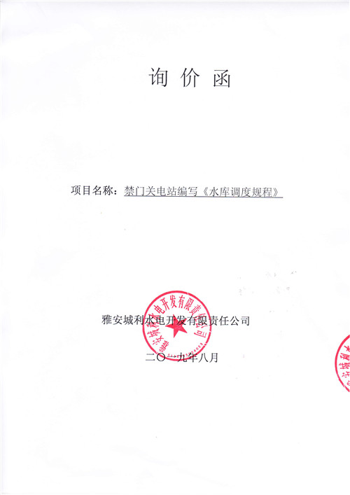 雅安城利水電開(kāi)發(fā)有限責(zé)任公司禁門(mén)關(guān)電站編寫(xiě)《水庫(kù)調(diào)度規(guī)程》競(jìng)爭(zhēng)性談判公告