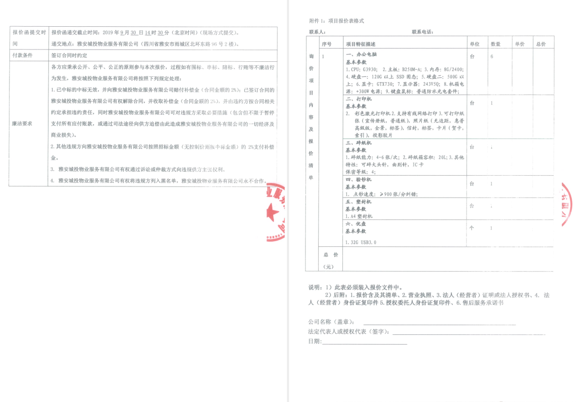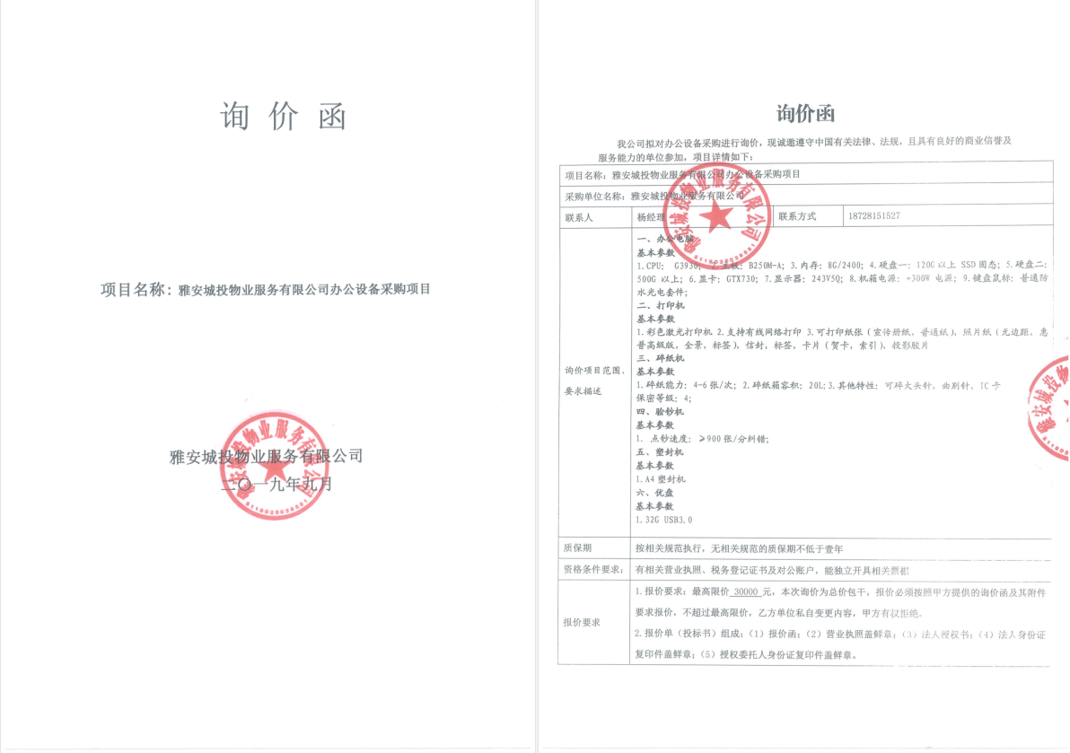 雅安城投物業(yè)詢價函(辦公設備)