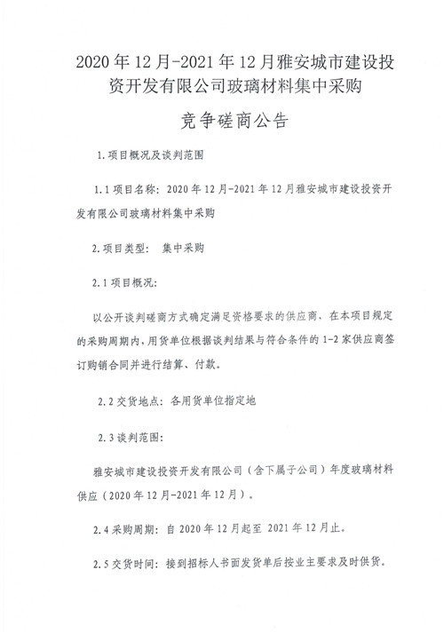 2020年12月-2021年12月雅安城市建設(shè)投資開(kāi)發(fā)有限公司玻璃材料集中采購(gòu)競(jìng)爭(zhēng)磋商公告