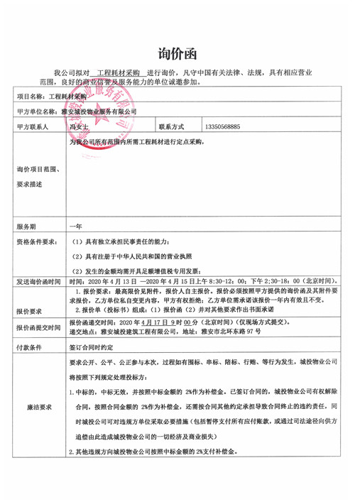 城投物業(yè)公司工程耗材采購詢價(jià)函(第二次)