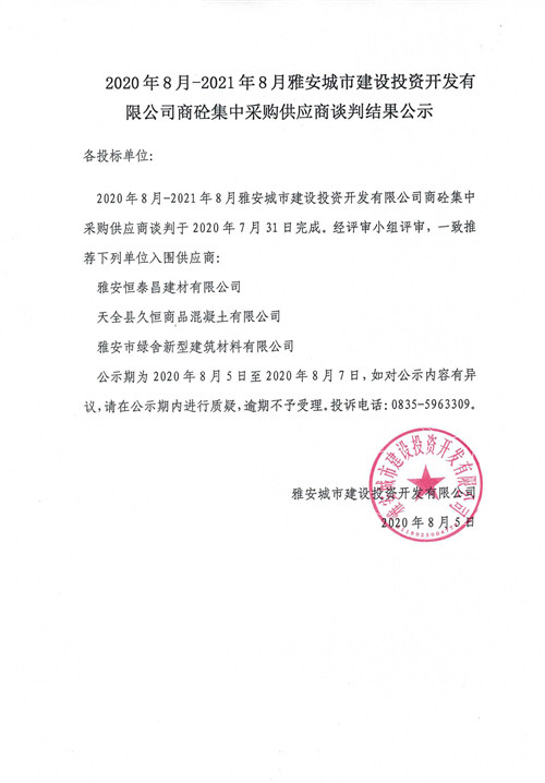 2020年8月-2021年8月雅安城市建設(shè)投資開發(fā)有限公司商砼集中采購供應(yīng)商談判結(jié)果公示