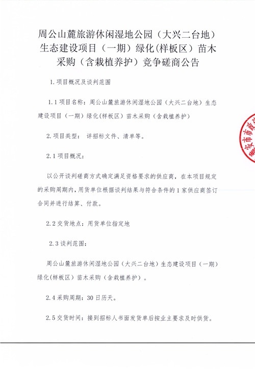 周公山麓旅游休閑濕地公園(大興二臺地)生態(tài)建設(shè)項目(一期)綠化(樣板區(qū))苗木采購(含栽植養(yǎng)護(hù))競爭磋商公告