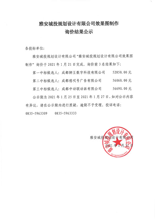 雅安城投規(guī)劃設計有限公司效果圖制作詢價結果公示