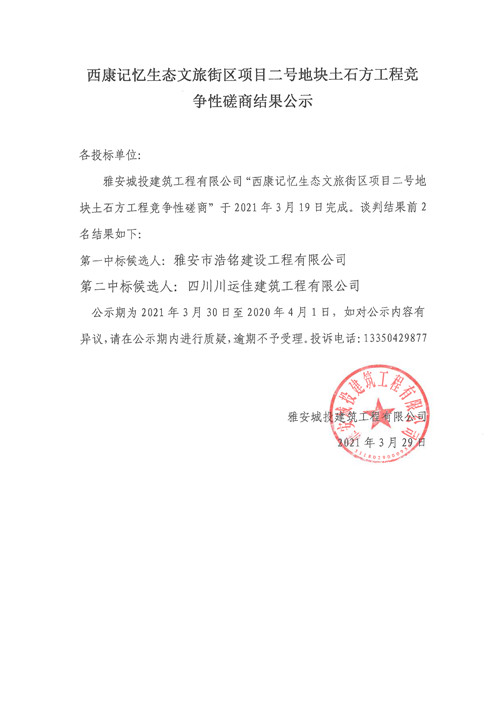 城投建工公司雅安市西康記憶生態(tài)文旅街區(qū)項(xiàng)目二號(hào)地塊土石方工程競(jìng)爭(zhēng)性磋商結(jié)果公示
