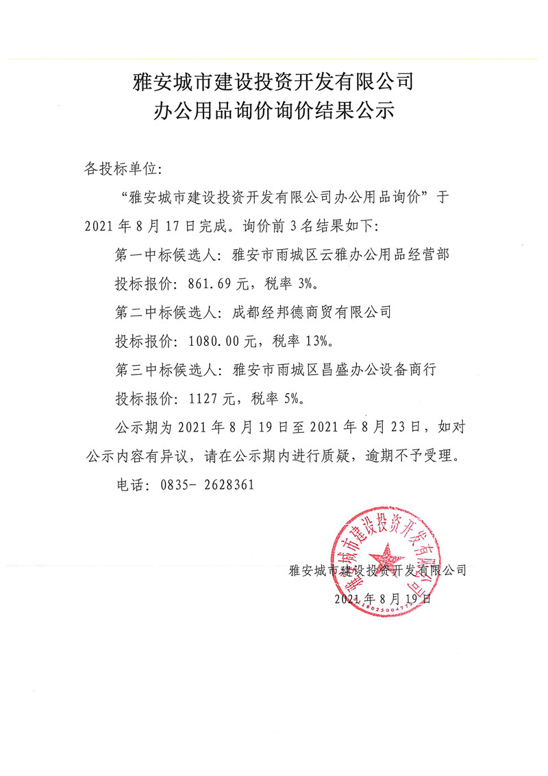城投公司辦公用品詢價(jià)結(jié)果公示