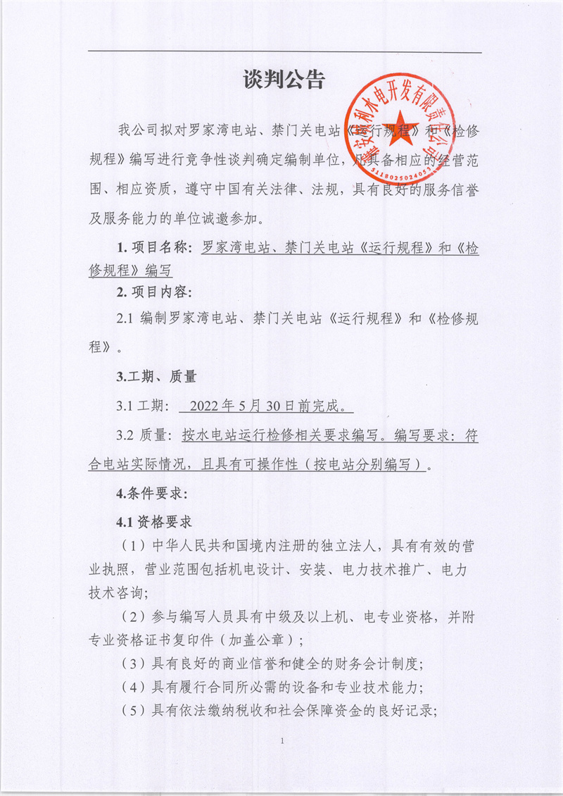 羅家灣電站、禁門關(guān)電站《運行規(guī)程》和《檢修規(guī)程》編寫競爭性談判公告