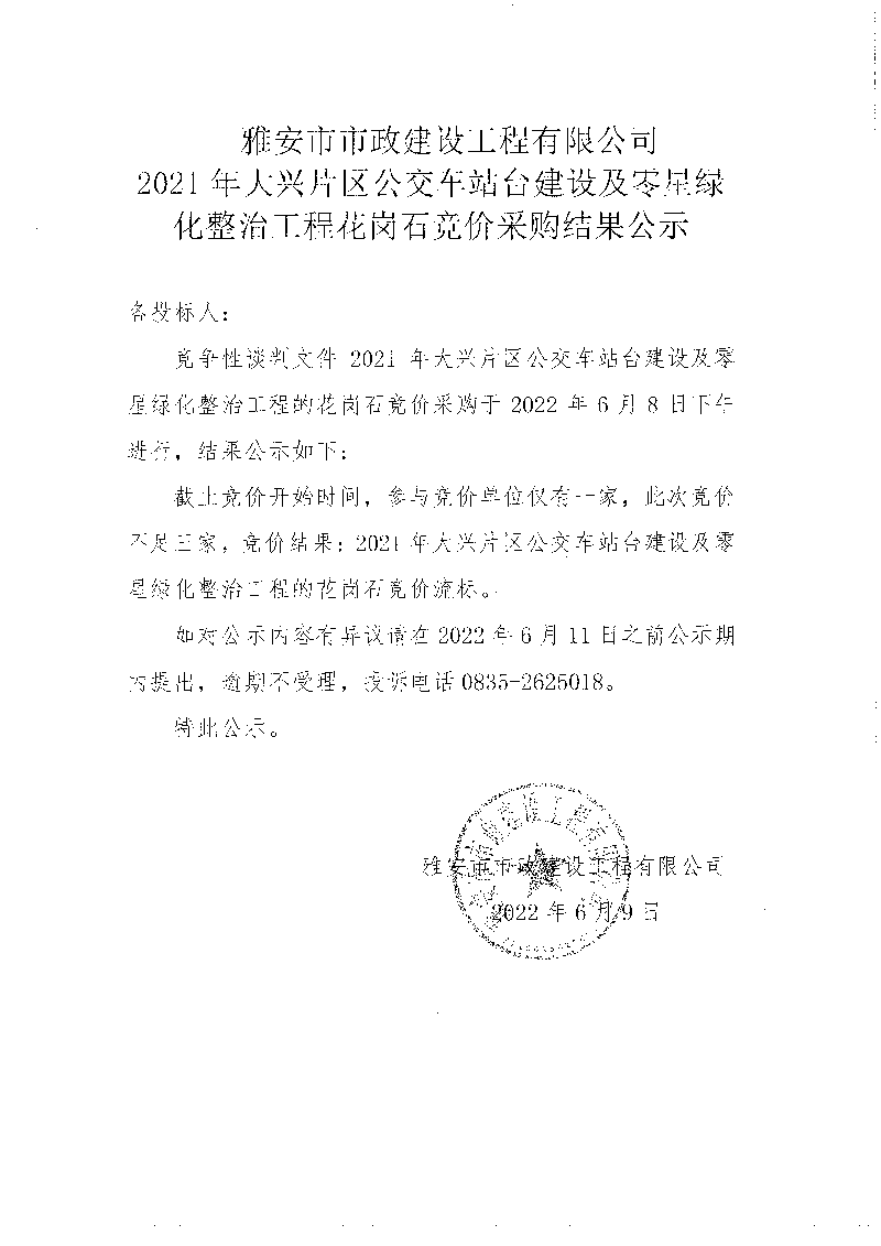 2021年大興片區(qū)公交站臺建設(shè)及零星綠地整治工程花崗石競價(jià)采購結(jié)果公示