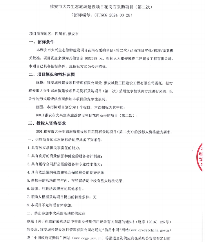 雅安市大興生態(tài)旅游建設(shè)項(xiàng)目花崗石采購(gòu)項(xiàng)目(第二次)公告
