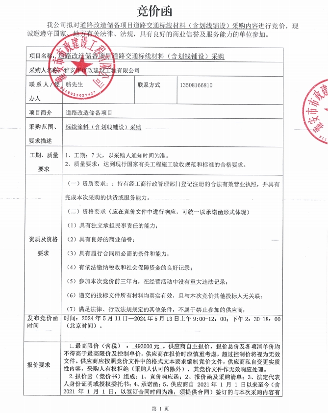 道路改造儲備項目道路交通標(biāo)線材料(含劃線鋪設(shè))采購競價公告