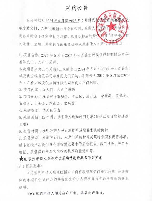2024年5月至2025年4月雅安城投供應(yīng)鏈有限公司年度防火門(mén)、入戶(hù)門(mén)采購(gòu)公告