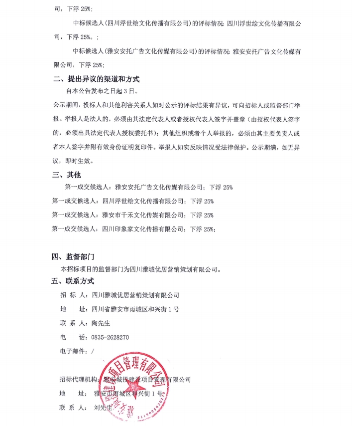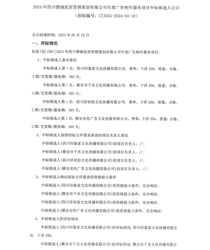 2024年四川雅城優(yōu)居營(yíng)銷策劃有限公司年度廣告制作服務(wù)項(xiàng)目中標(biāo)候選人公示