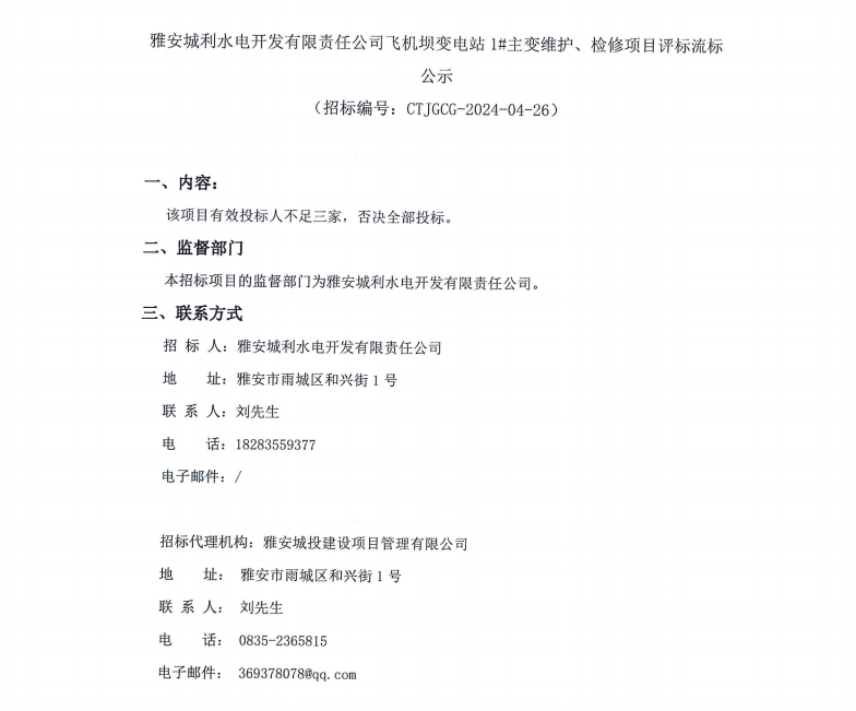 雅安城利水電開發(fā)有限責(zé)任公司飛機(jī)壩變電站1#主變維護(hù)、檢修項(xiàng)目評(píng)標(biāo)流標(biāo)公示