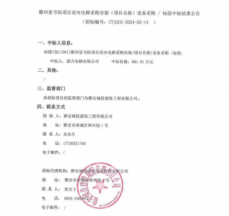 雅州壹號院項(xiàng)目室內(nèi)電梯采購安裝(項(xiàng)目名稱)設(shè)備采購/標(biāo)段中標(biāo)結(jié)果公告