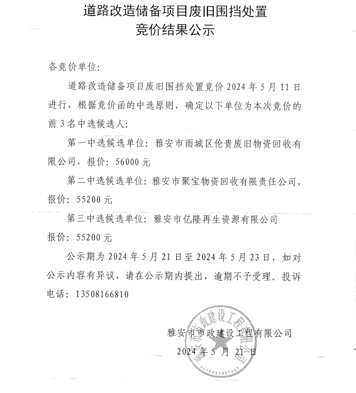 道路改造儲備項目廢舊圍擋處置競價結(jié)果公示