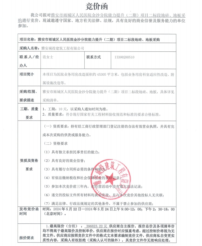 雅安市雨城區(qū)人民醫(yī)院金沙分院能力提升(二期)項(xiàng)目二標(biāo)段地磚、地板采購競價(jià)公告