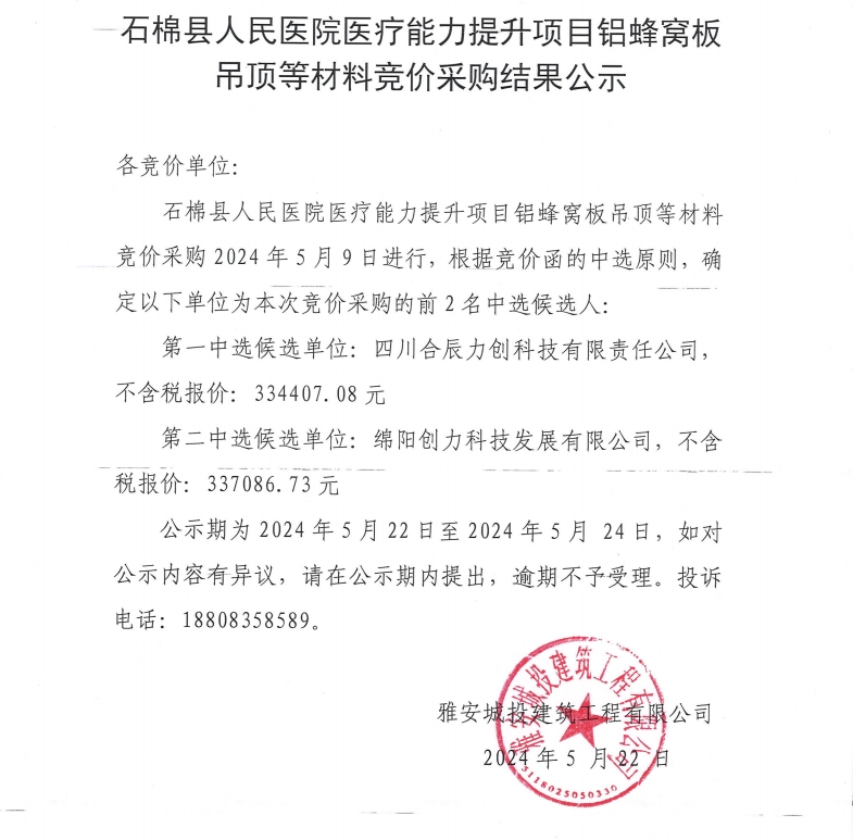 石棉縣人民醫(yī)院醫(yī)療能力提升項(xiàng)目鋁蜂窩板吊頂?shù)炔牧细?jìng)價(jià)采購(gòu)結(jié)果公示