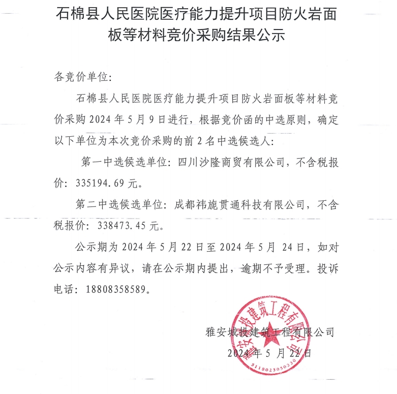 石棉縣人民醫(yī)院醫(yī)療能力提升項(xiàng)目防火巖面板等材料競(jìng)價(jià)采購結(jié)果公示
