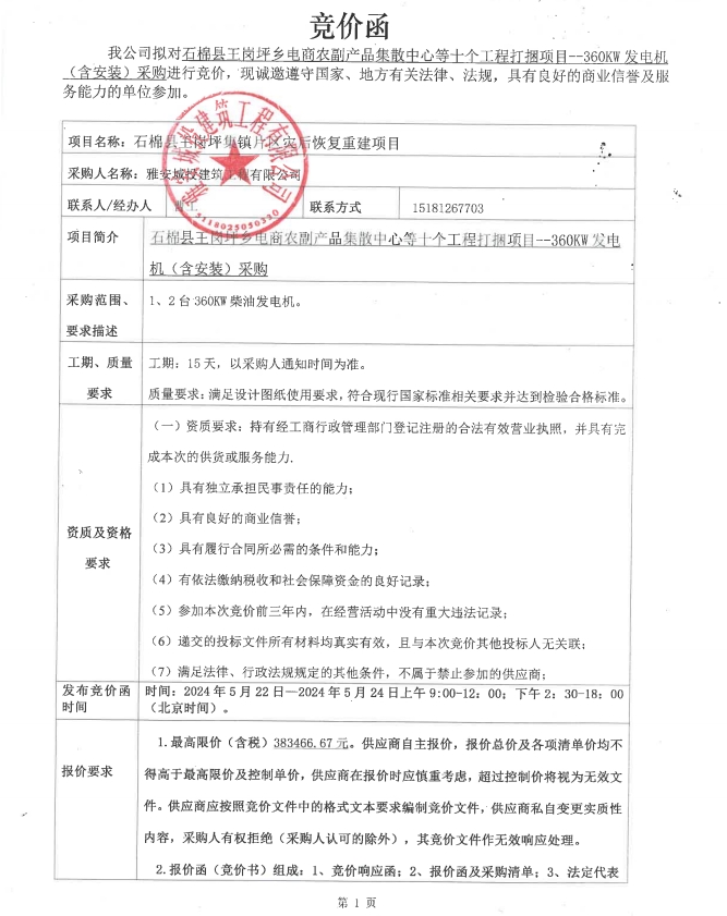 石棉縣王崗坪鄉(xiāng)電商農(nóng)副產(chǎn)品集散中心等十個(gè)工程打捆項(xiàng)目--360KW發(fā)電機(jī)(含安裝)采購(gòu)競(jìng)價(jià)公告