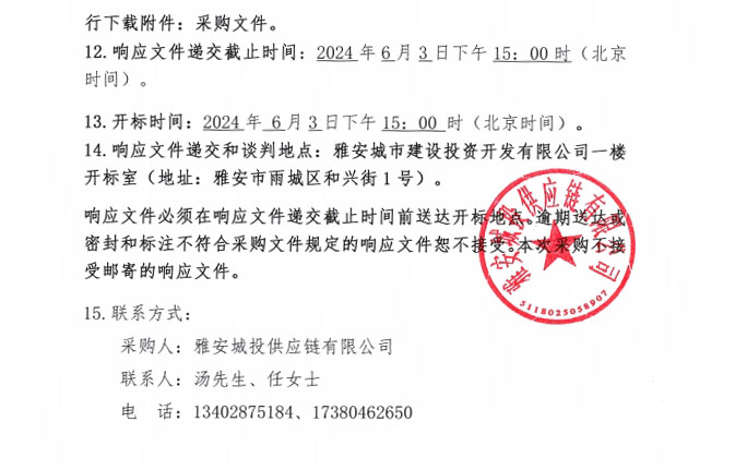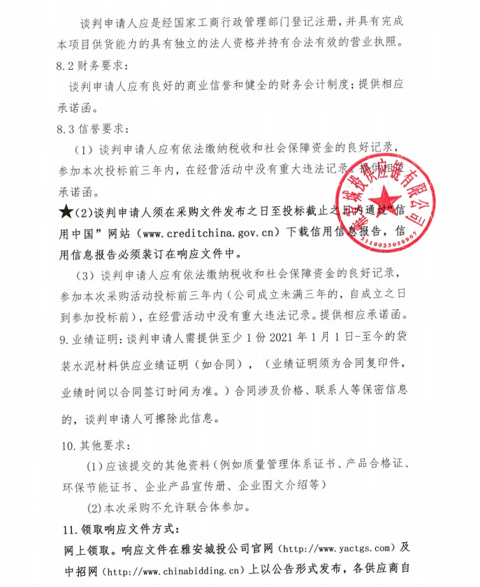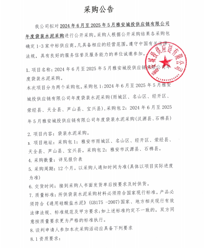 2024年6月至2025年5月雅安城投供應(yīng)鏈有限公司年度袋裝水泥采購(gòu)公告