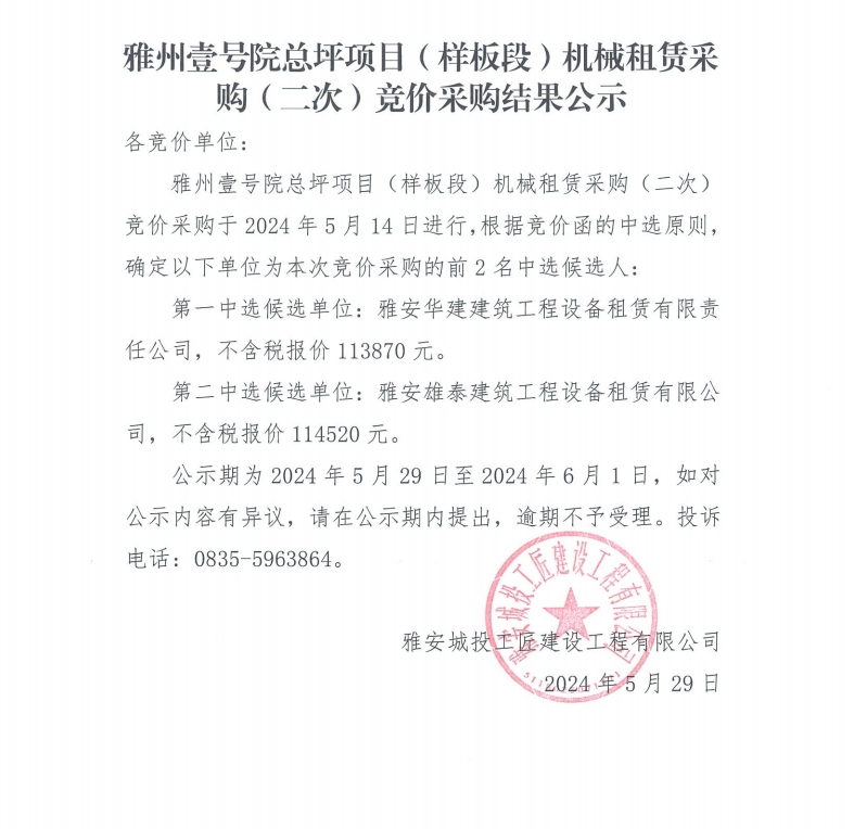 雅州壹號院總坪項目(樣板段)機(jī)械租賃采購(二次)競價采購結(jié)果公示