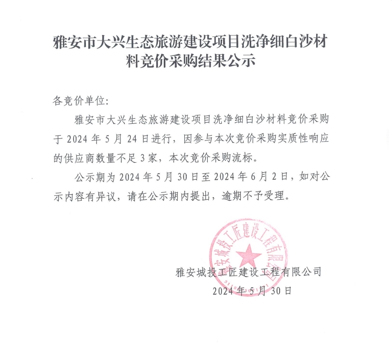 雅安市大興生態(tài)旅游建設(shè)項(xiàng)目洗凈細(xì)白沙材料競(jìng)價(jià)采購(gòu)結(jié)果公示