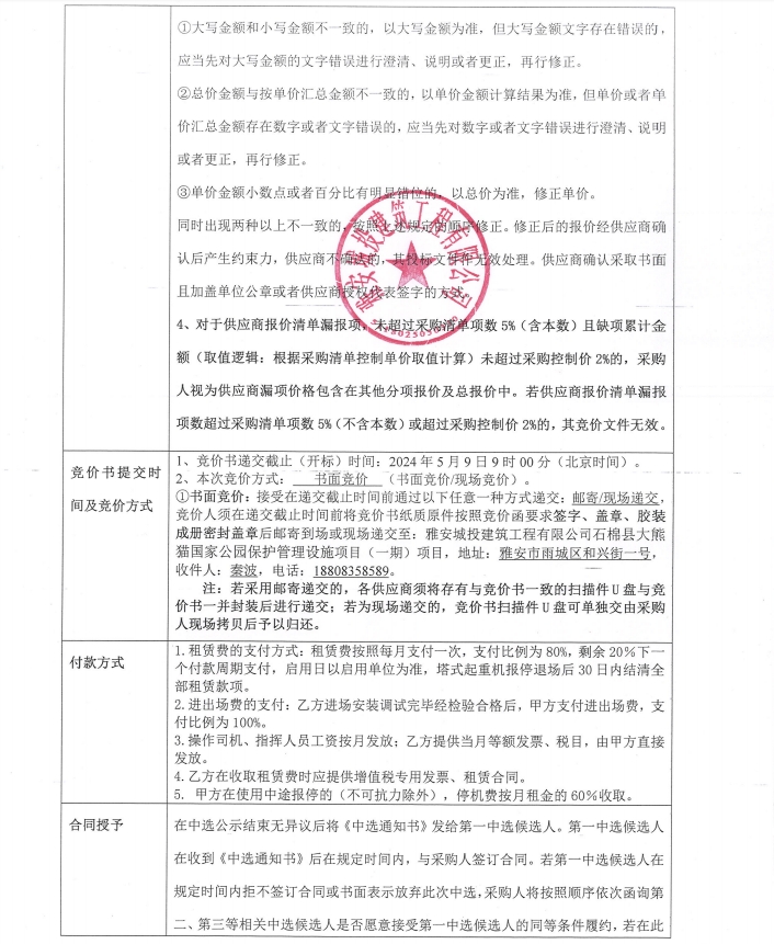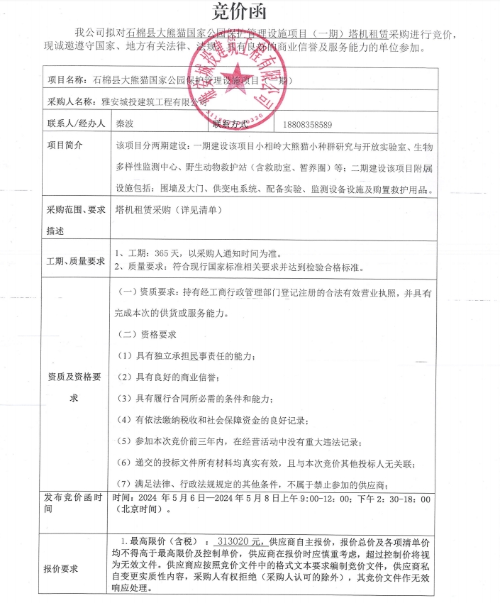 石棉縣大熊貓國家公園保護(hù)管理設(shè)施項(xiàng)目(一期)塔機(jī)租賃采購競價公告