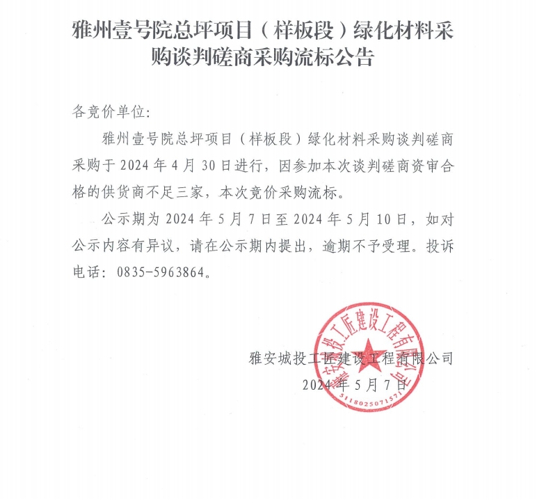 雅州壹號(hào)院總坪項(xiàng)目(樣板段)綠化材料采購談判磋商采購流標(biāo)公告