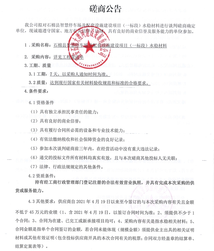 石棉縣智慧停車場(chǎng)及配套設(shè)施建設(shè)項(xiàng)目(一標(biāo)段)水穩(wěn)材料采購談判磋商公告