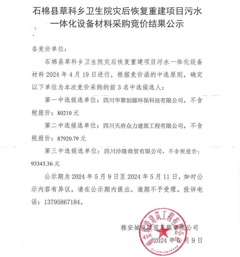 石棉縣草科鄉(xiāng)衛(wèi)生院災后恢復重建項目污水一體化設(shè)備材料采購競價結(jié)果公示