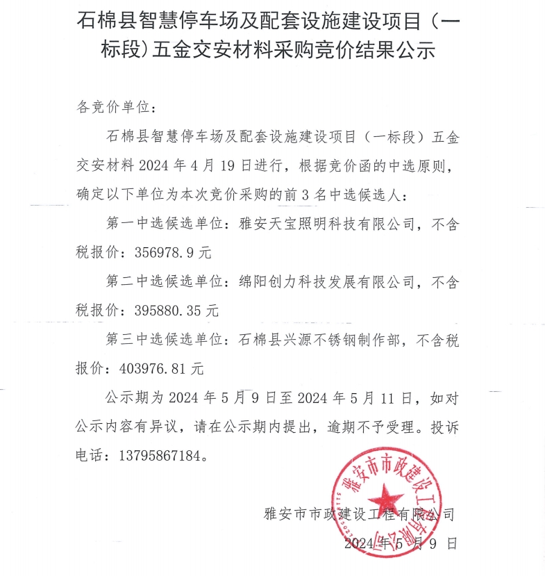 石棉縣智慧停車場(chǎng)及配套設(shè)施建設(shè)項(xiàng)目(一標(biāo)段)五金交安材料采購競(jìng)價(jià)結(jié)果公示