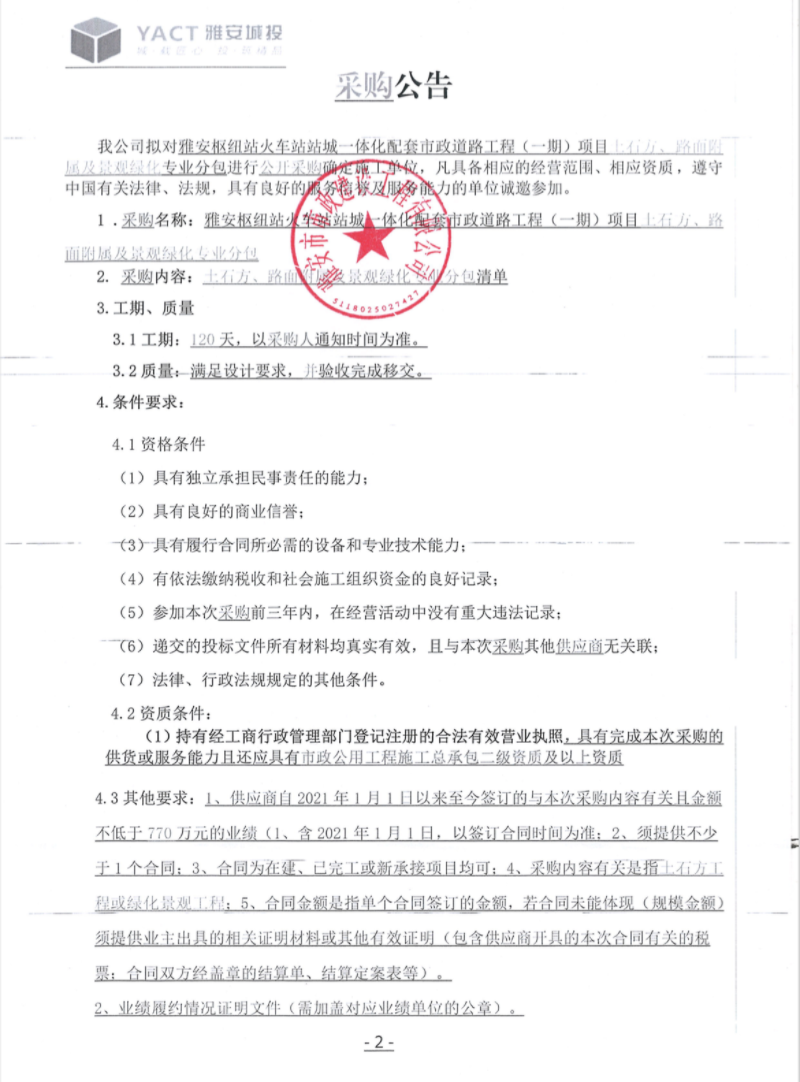雅安樞紐站火車站站城一體化配套市政道路工程(一期)項(xiàng)目土石方、路面附屬及景觀綠化專業(yè)分包采購(gòu)公告