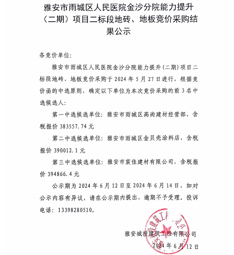 雅安市雨城區(qū)人民醫(yī)院金沙分院能力提升(二期)項(xiàng)目二標(biāo)段地磚、地板競(jìng)價(jià)采購(gòu)結(jié)果公示