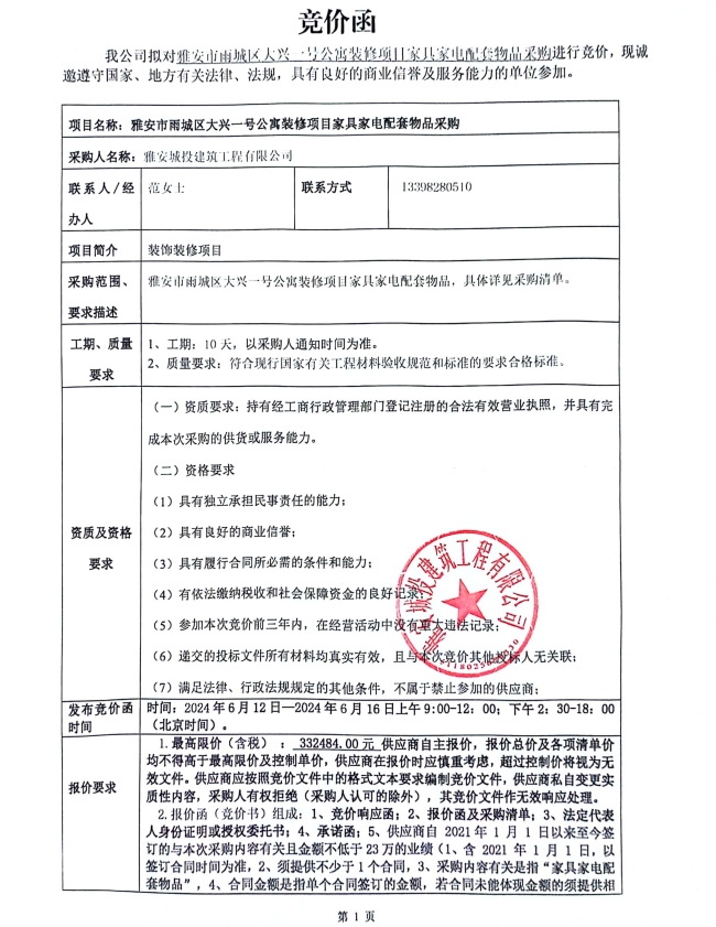 雅安市雨城區(qū)大興壹號公寓裝修項目家具電配套物品采購競價公告