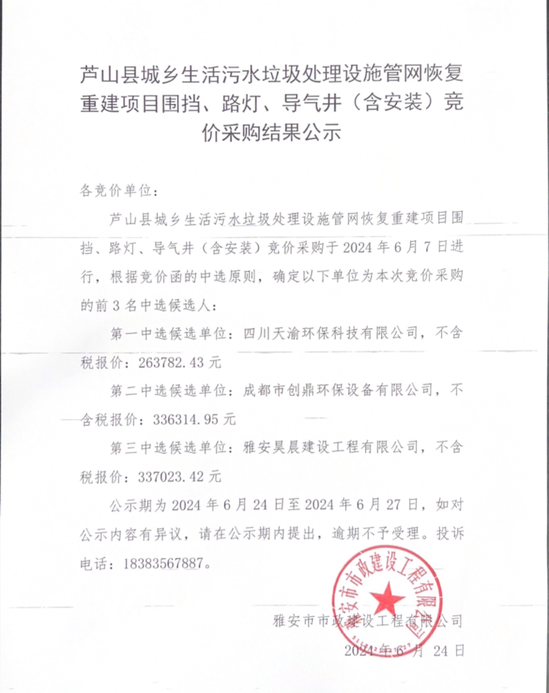 蘆山縣城鄉(xiāng)生活污水垃圾處理設(shè)施管網(wǎng)恢復(fù)重建項目圍擋、路燈、導(dǎo)氣井(含安裝)競價采購結(jié)果公示