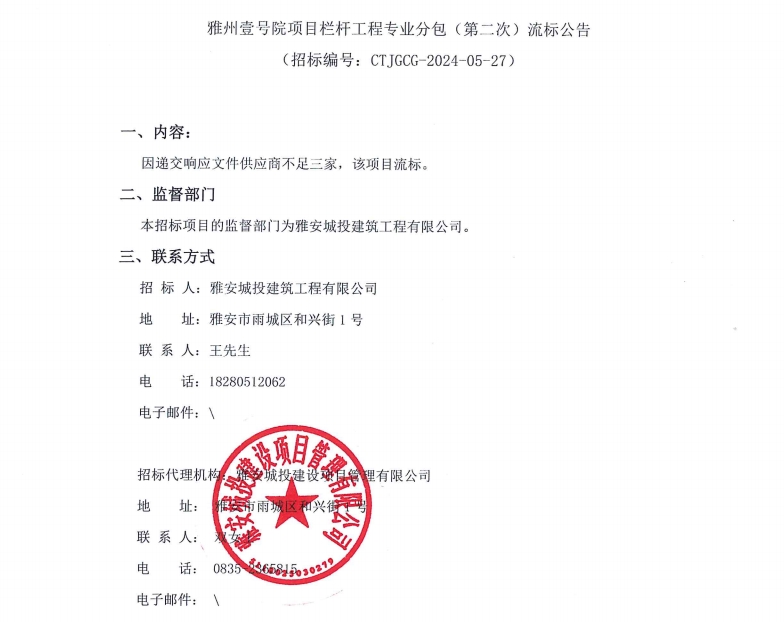 雅州壹號院項目欄桿工程專業(yè)分包(第二次)流標公告