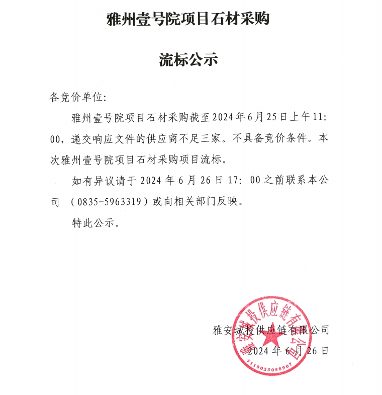 雅州壹號(hào)院項(xiàng)目石材采購(gòu)流標(biāo)公示