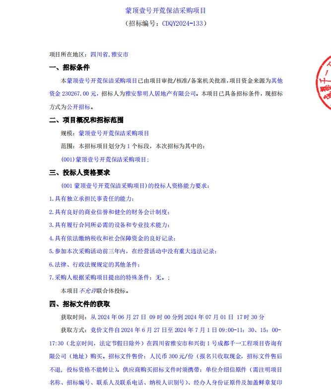 蒙頂壹號開荒保潔采購項(xiàng)目公告
