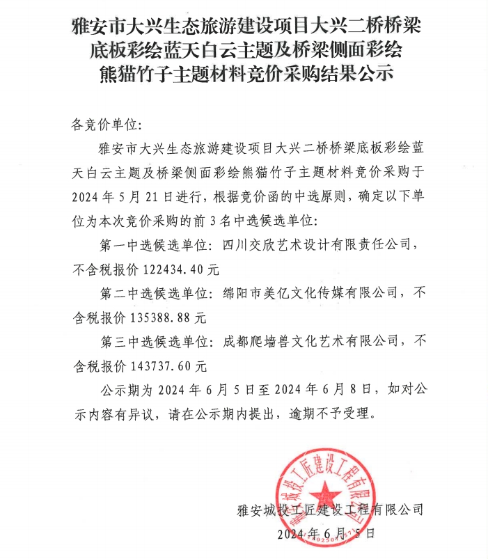 雅安市大興生態(tài)旅游建設(shè)項目大興二橋橋梁底板彩繪藍天白云主題及橋梁側(cè)面彩繪熊貓竹子主題材料采購結(jié)果公示