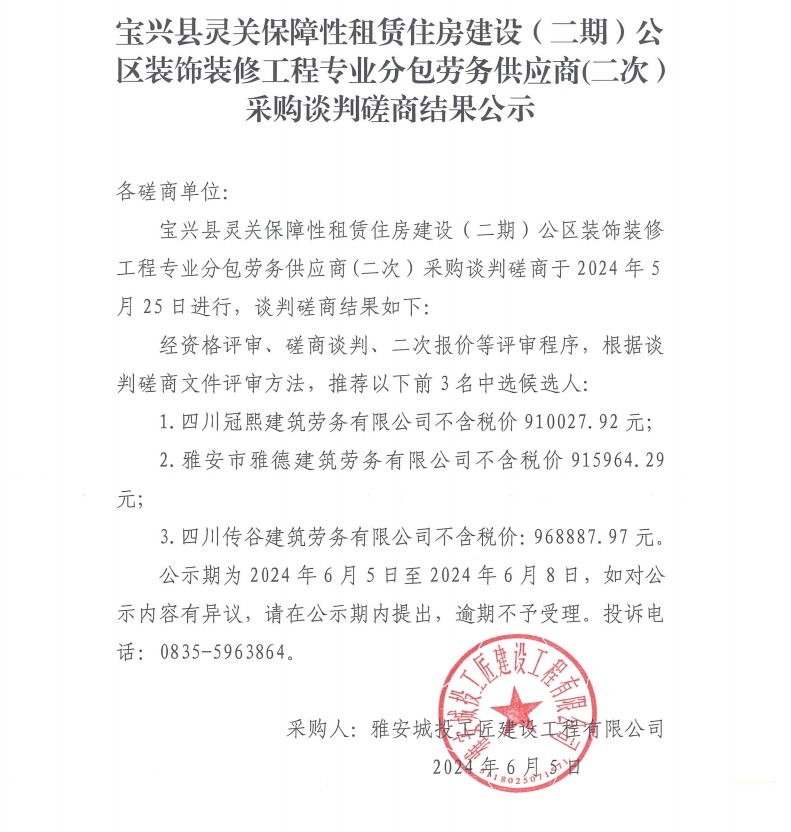 寶興縣靈關保障性租賃住房建設(二期)公區(qū)裝飾裝修工程專業(yè)分包勞務供應商(二次)采購談判磋商結(jié)果公示