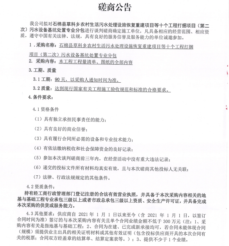 石棉縣草科鄉(xiāng)農(nóng)村生活污水處理設(shè)施恢復重建項目等十個工程打捆項目(第二次) 污水設(shè)備基坑處置專業(yè)分包采購談判磋商公告