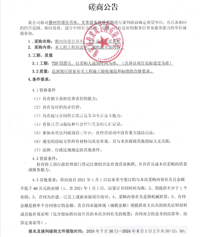 雅州印項目吊車、叉車設(shè)備租賃采購談判磋商公告