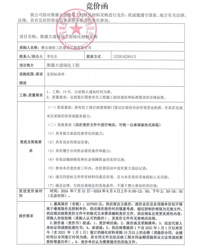 熊貓大道綠化工程綠化材料采購(gòu)競(jìng)價(jià)公告