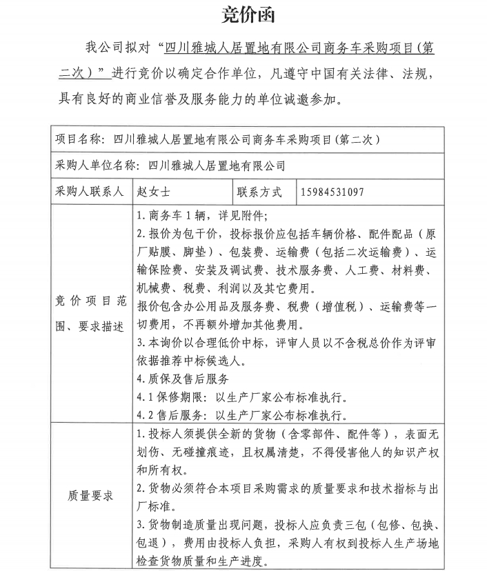 四川雅城人居置地有限公司商務(wù)車采購(gòu)項(xiàng)目(第二次)競(jìng)價(jià)公告