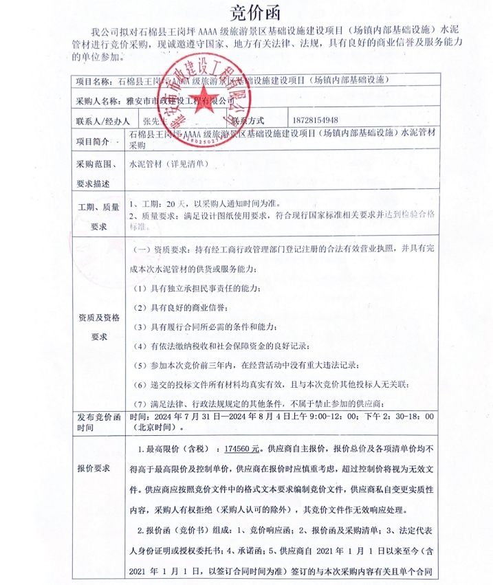 石棉縣王崗坪AAAA級(jí)旅游景區(qū)基礎(chǔ)設(shè)施建設(shè)項(xiàng)目(場(chǎng)鎮(zhèn)內(nèi)部基礎(chǔ)設(shè)施)水泥管材采購競(jìng)價(jià)公告