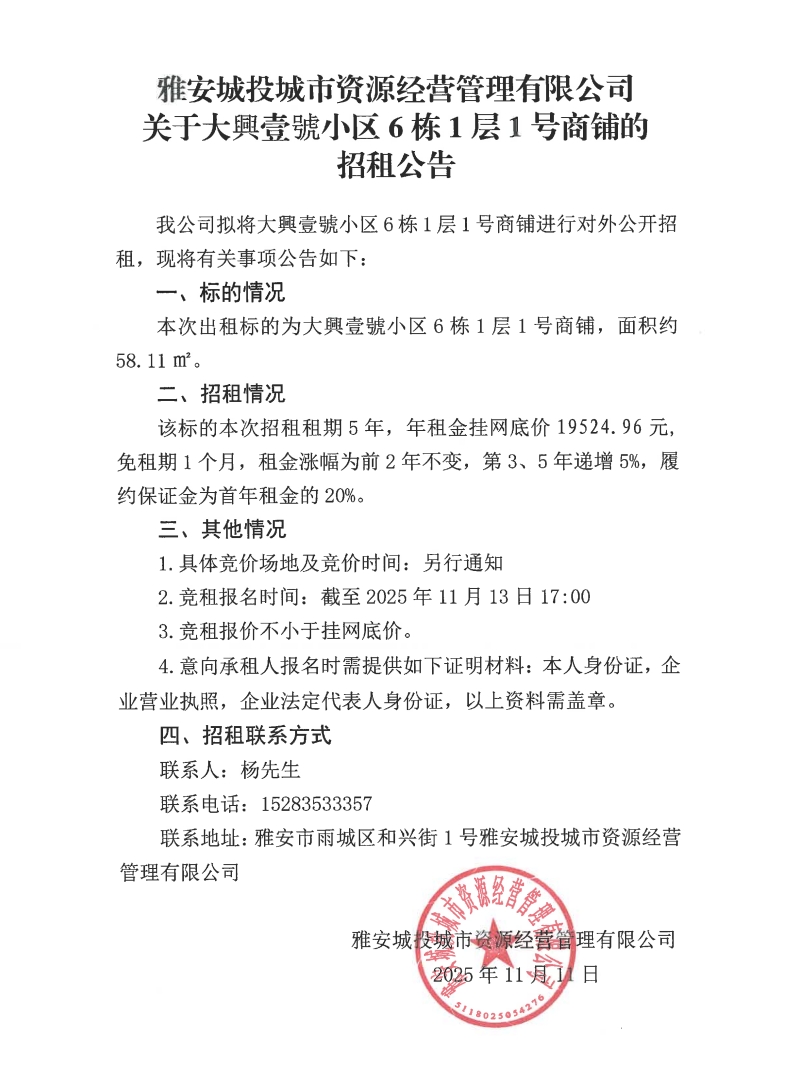雅安城投城市資源經(jīng)營(yíng)管理有限公司關(guān)于大興壹號(hào)小區(qū)6棟1層1號(hào)商鋪的招租公告